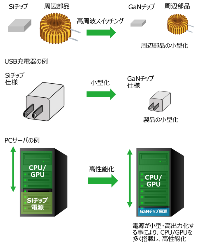 GaNパワーデバイスは高速なスイッチング特性に特徴があるため、スイッチング電源などの小型・高周波用途で有利な特性となります。