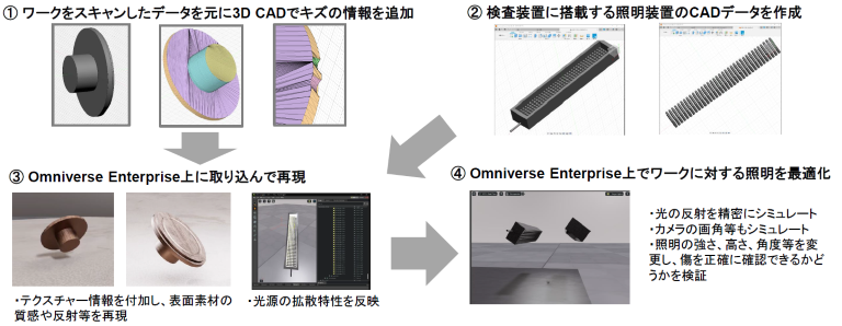 自動車業界では、LED照明装置のCADデータをOmniverse上で再現し、発光特性や傷の検出をシミュレーションする取り組みが進行中です。高精度3DスキャナーやBRDF測定装置との連携により、検査精度の向上が図られています。