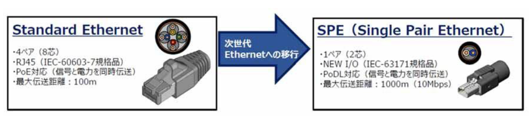現在、RJ45イーサネットが使用されている場所や、低電圧で給電したい場所が主なターゲットとなりますが、既存のイーサネット環境からの移行はもちろん、これまでイーサネット化できなかった領域への展開も期待されています。