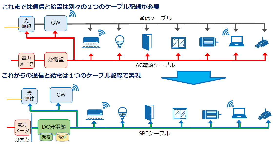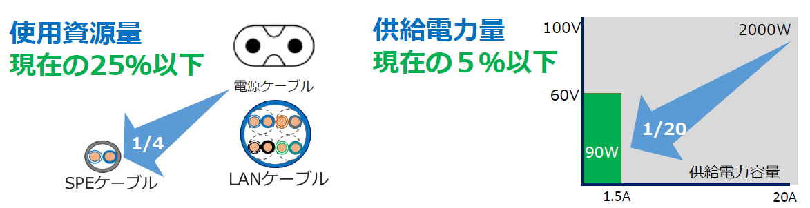 通信は無線でも光ファイバーでも実現できますが、電源をシングルペアで送るということが今までにない大きな特徴です。SPEでは直流で送電しており、感電保護やブレーカーなどの安全機能がすべて規格に含まれています。