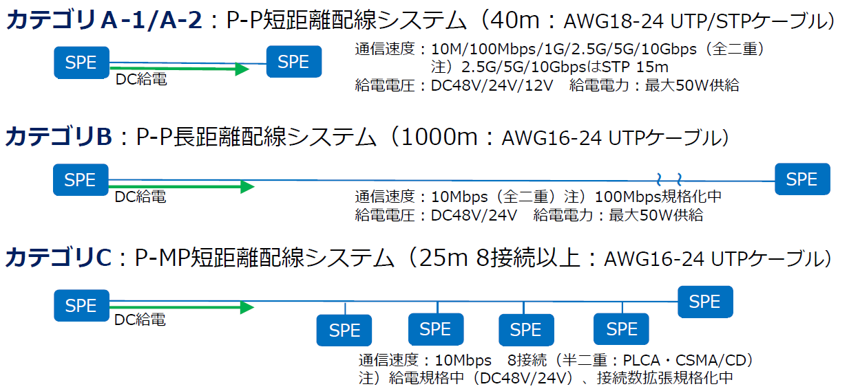 カテゴリAは短距離用で10Mbpsから10Gbpsまでをカバーし、カテゴリBは長距離用、カテゴリCはバス接続用として、それぞれのユースケースに応じた適切な規格と実装方法が提示される予定です。
