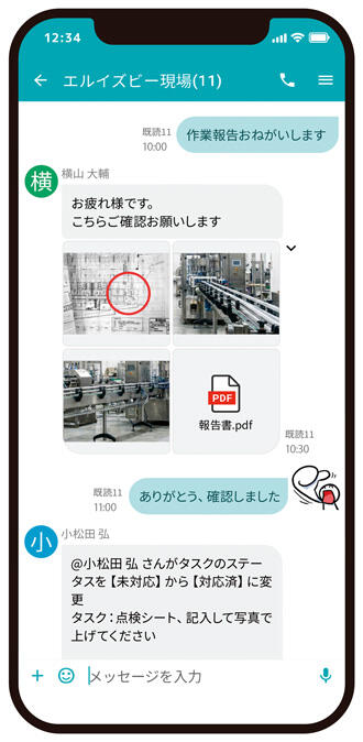 製造現場では、刻々と状況が変化するため、リアルタイムでの情報共有が不可欠です。ビジネスチャットは、スマートフォンやタブレットから手軽に写真や動画を共有できるため、視覚的な情報伝達が容易になります。これにより、口頭では伝えにくい細かな状況も正確に共有でき、現場での迅速な意思決定をサポートします。また、作業日報や点検結果の報告もチャット上で行えるため、事務所に戻る手間を省き、業務効率を大幅に向上させることが可能です。