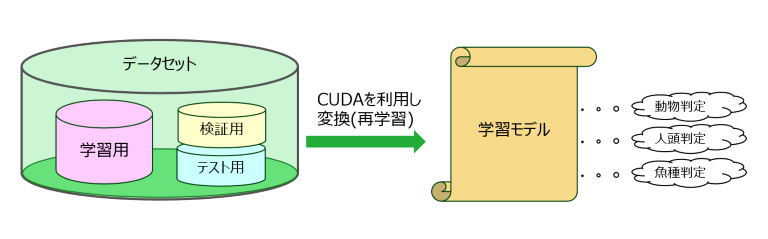 学習モデルは実質的に、入力されたデータに対して幾重にも重なった計算を行い、特徴的なところを抽出して判断します。この演算式は浮動小数点演算という計算を大量に組み合わせており、これがGPU環境を必要とする理由となっています。AI学習は膨大な計算を行うため、CUDA対応GPUがないと実用的な学習は困難です。